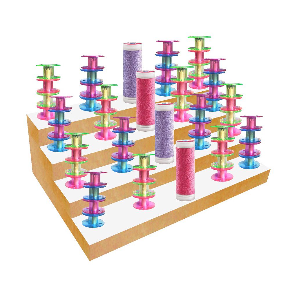 ORGANIZADOR PORTA BOBINAS E RETRÓS COM 20 PINOS Material: Madeira Tamanho: 12cm x 19cm Capacidade: 20 pinos que comportam ate 5 bobinas cada (100 bobinas no total)